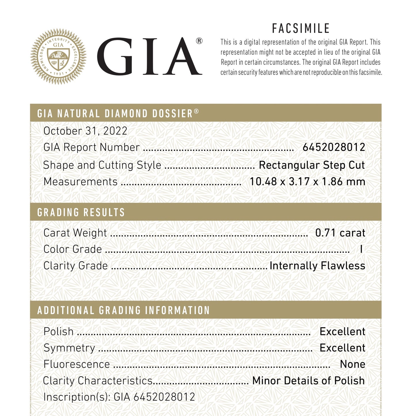 Share0.71ct 10.48x3.17x1.86mm GIA Internally Flawless I Baguette Step Cut 24302-01 Dallas Maynard Jewelry