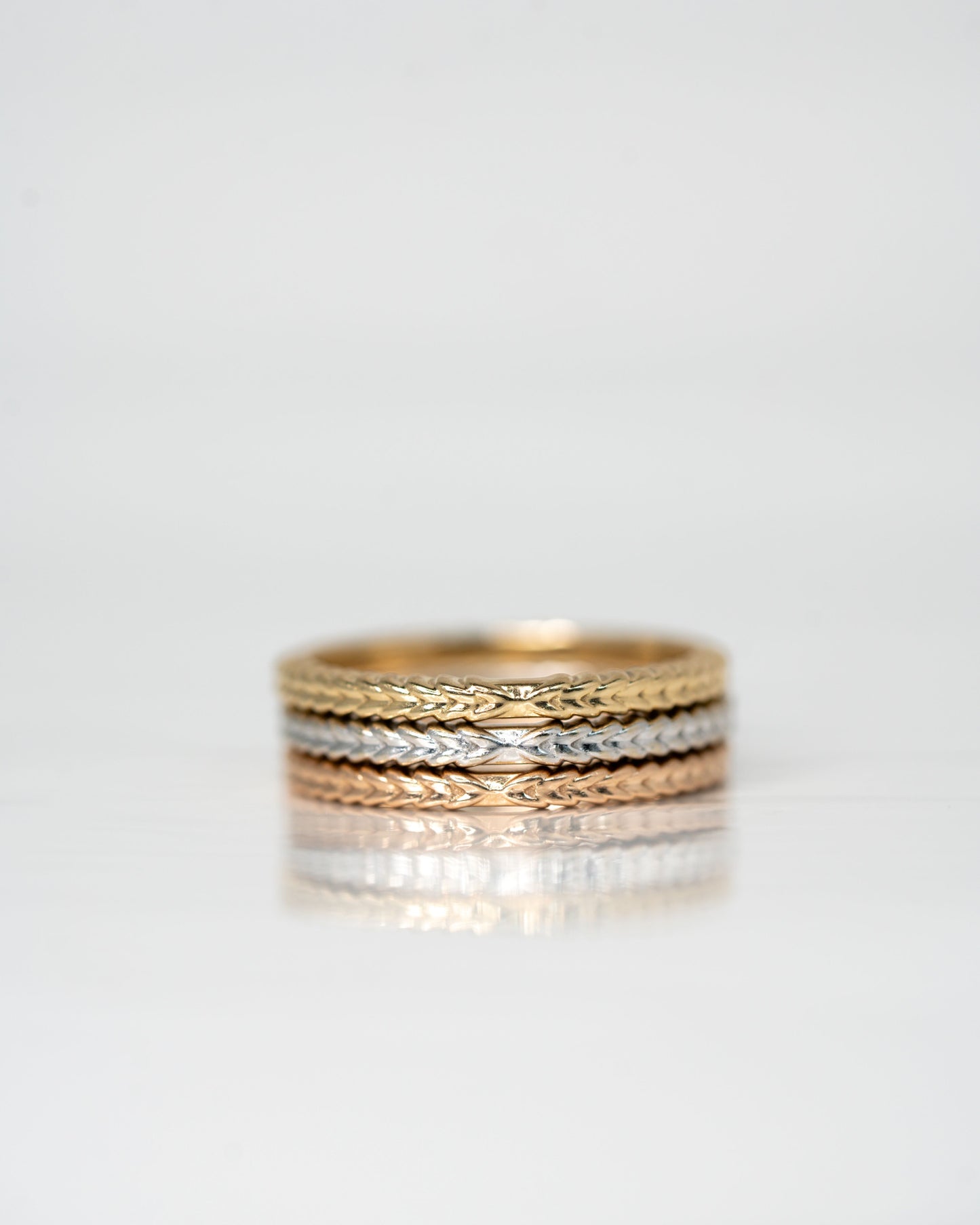 A straight band with its own personality. Woven, squiggling details surround the band for a fun an unexpected addition to your stack.